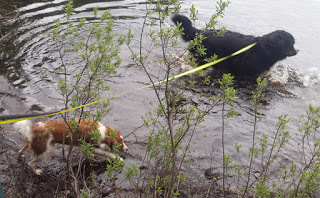 Efter förra veckans överraskande bad blev det den här veckan en planerad simtur. Tyvärr fick jag ingen filmsnutt från när Kotten och Kiara var en bra bit ut i Ronnebyån, eftersom jag hade fullt upp med att se till att inte falla i vattnet själv. Hundarna älskade att bada. Så roligt för Kiara att få sällskap i vattnet.