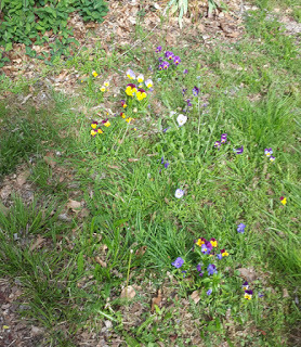 Förra årets penséer i blomsterlådorna har spridit sig ut till gräsmattan. Vi får se hur länge de får leva där innan husse har kört över dem med gräsklipparen...