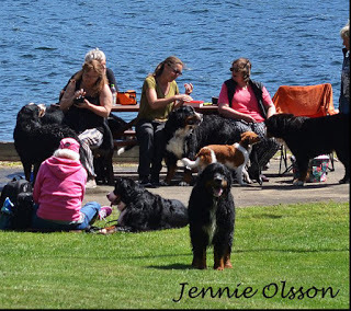 Det var väldigt många som anslöt till Sennenträffen. Det sprang lösa hundar överallt, vuxna hundar och valpar och många väldigt blöta hundar. För det är ju så med Berner Sennenhundar, att de flesta älskar vatten.