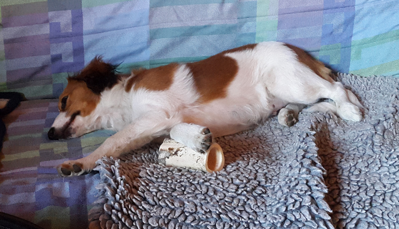 Ser inte värst bekvämt ut att ha ett ben som huvudkudde, men Kotten sov gott på det vid mina fötter.