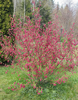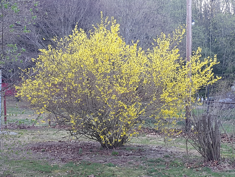 Förra måndagen, då den här bilden togs, hade Forsythian inte kommit så långt, inte heller gräset hade börjat växa, men efter en vecka med sol och värme är forsythian gyllengul och gräset lång och det är dags att klippa det för första gången.