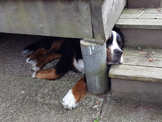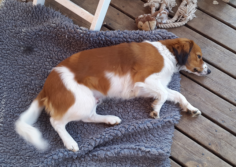 Så här har Kiara legat sedan hon var en liten valp. Då fick hon in hela huvudet i hålet, nu får bara nosen plats där. Hon har svårt att ta sig in och får göra riktig gymnastikövning för att komma på plats, men hon älskar att ligga här, svalt och skönt.