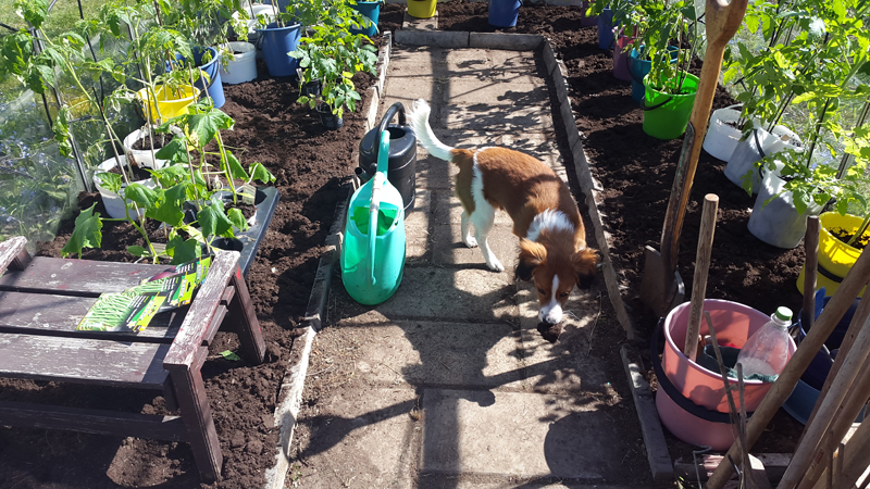En nyhet för den här veckan är arbetet i växthuset. Kotten har varit med när vi har kört ut jord och kört in gödsel och ny jord. Han har hjälpt till genom att stjäla små gödselklumpar som han sprungit ut med för att mumsa i sig...
