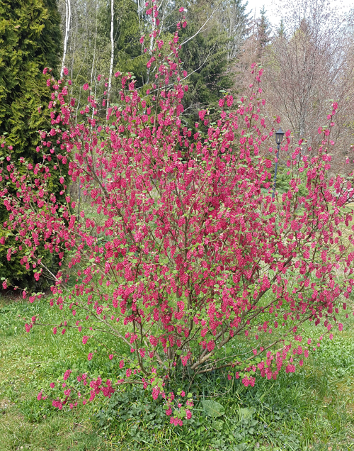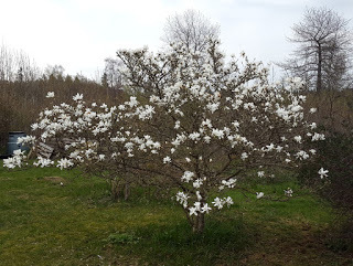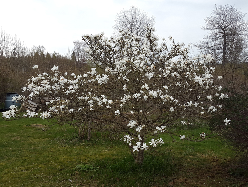 Magnolian har slagit ut, men är inte lika vacker som förr, eftersom en del av busken har blivit uppäten av älgarna.