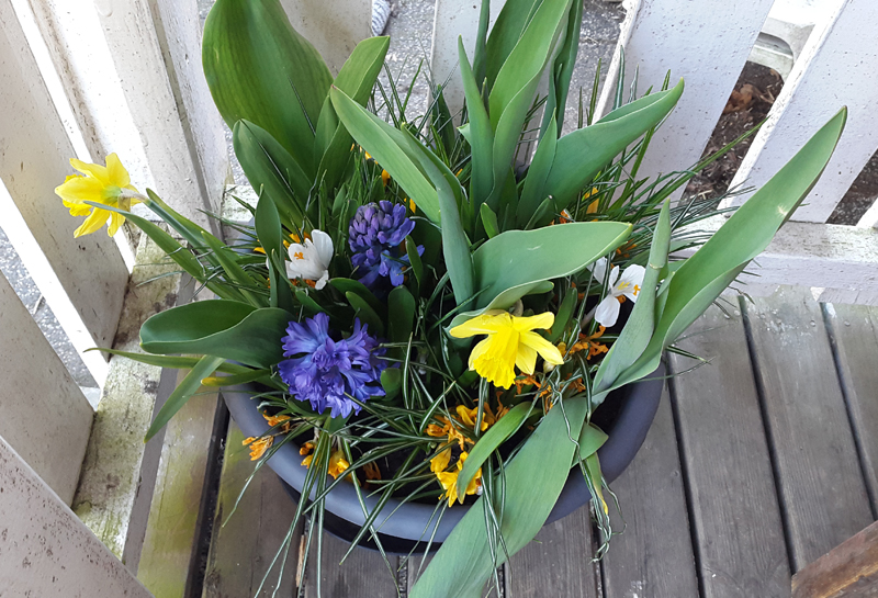 Den här krukan har stått på verandan sedan i höstas då jag satte krokus, hyacinter, påskliljor och tulpaner i den, som ett litet experiment. Både Kotten och Kiara har haft svårt att låta bli jorden i krukan, därför har vi fått ha galler för. Men nu blommar det för fullt. Bara tulpanerna som inte har slagit ut ännu. Nu kan gallret tas bort och vi kan njuta av blomsterprakten.