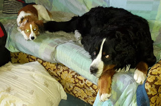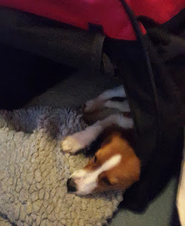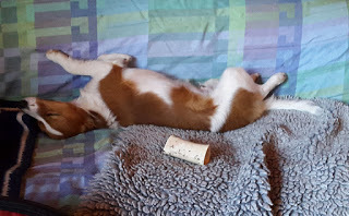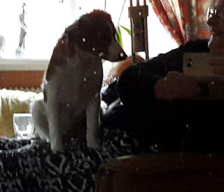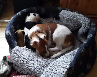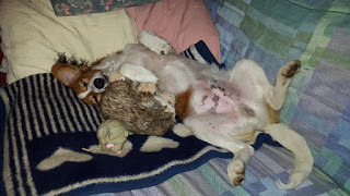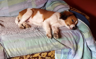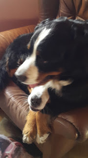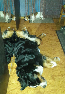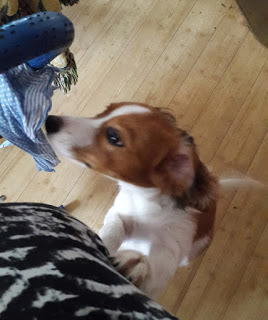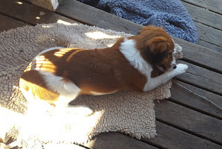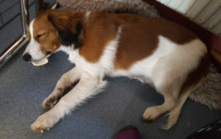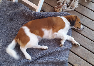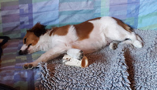 Just nu ligger han på mina fötter. Trött efter att ha busat med bollen i trädgården. Kanske försöker han hålla mig kvar också, för jag tror nog han känner på sig att jag ska iväg alldeles strax.