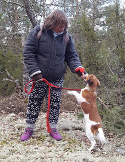 Ännu en vecka med Kotten. Nya spännande saker att utforska. Fler fjärilar, humlor och bin. Men den största utmaningen var spårträningen som Kotten gjorde för allra första gången i skogarna uppe vid Karlsnäs. Eftersom han alltid nosar överallt här hemma och spårar husse och mig, trodde jag att han skulle ta spåret direkt och sätta fart, så trodde även instruktören Jessica, men så blev det inte. Han var trött och förstod inte alls vad som var på gång, förrän allra sista sträckan. Då hade han förstått att om han följde spåret väntade godis och det gjorde det. Gott godis.