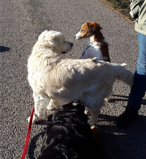 Det finns en hund till här i Kolshult, Frida, en goldentik. Det är inte ofta vi möter henne, men när vi gör det blir Kotten jätteglad. Kiara såg lite ledsen ut den här gången, för Frida hade bara ögon för Kotten. Normalt brukar hon leka med Kiara.