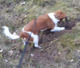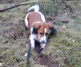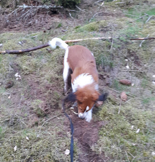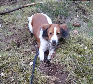 På onsdagen hade Kiara och jag spårträning på brukshundsklubben. Jag hade fruktansvärd huvudvärk efter en intensiv dag, så jag kunde inte göra träningen rättvisa, men Kiara var duktig. Dagen efter var det dags för Kotten att spåra. Bilderna är tagna efter att han har gått spår. Han är mycket trött. Vilket innebär att han blir helvild. Här börjar han gräva ett hål.