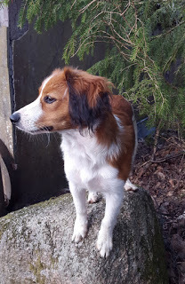 Kotten älskar att träna. Vi gör det flera gånger om dagen, både lydnad och lite agility. Här har han hoppat upp på den stora träningsstenen på vår naturliga agilitybana i skogen. Kiara har sprungit iväg och Kotten står och tittar efter henne. En ny vecka har börjat. Det ska bli spännande att se vad som händer.