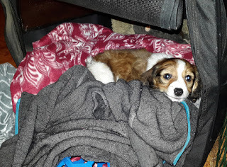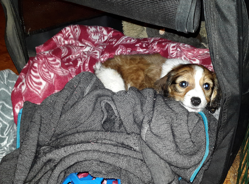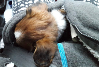 Han sov innanför min jacka hela vägen hem, 2,5 timma. Lite frusen i början eftersom han var nybadad, men till slut kröp han ut ur jackan, fortfarande sovande.
