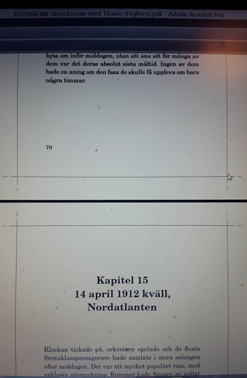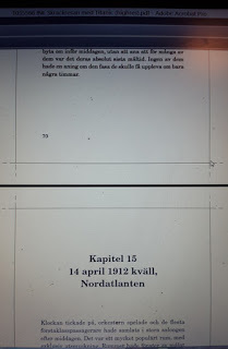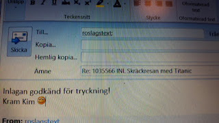Numera läser jag inte Inlagan på samma sätt som tidigare. När jag skickar till tryckeriet ska det vara rätt, att korrigera i Inlagan är inte bra, det kostar extra. När det gäller Skräckresan med Titanic är det femte gången vi trycker om boken, så där kontrollerade jag bara att alla kapitel är med och samtliga sidor. Det gör jag genom att läsa sista raden och första raden på varje sida.