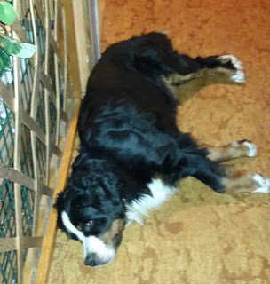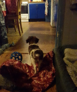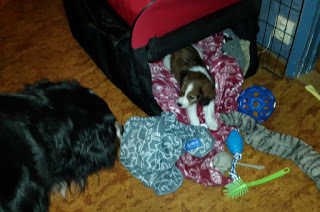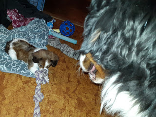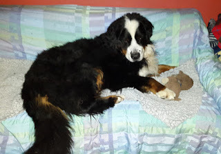 Tudor var snabb med att hämta sin apa och "rädda den" från Kotten. Han hoppade upp i hundsoffan, där jag har sovit inatt för att hålla Kotten sällskap. När Tudor kom som ny valp i huset lade sig vår gamle hane, Pluto (döpt efter Pluto i