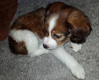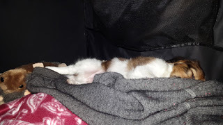 Blev så glad när vi fick en Kotte, Igelkott, som mjukisdjur av uppfödaren Katarina Bladh på Moonhavens kennel. Den släpade Kotten direkt in i sitt hus, du skymtar den längst in till vänster. Tror den blev lite som en valpkompis att luta sig mot. Kotten sover här lugnt och skönt, uttröttad av dagens händelse.