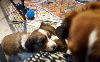 När vi fick komma in till valparna slog jag mig ner på golvet och blev överfallen av sex valpar och deras vakande mamma. Vi var de första besökarna och varken mamma eller valparna var vana vid främmande.