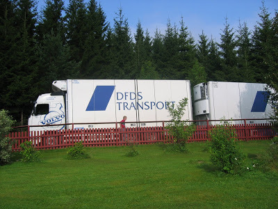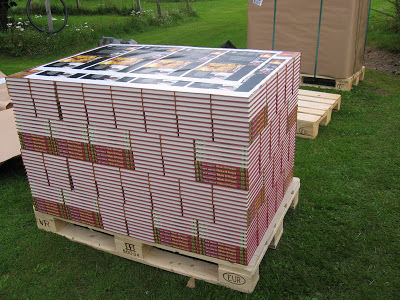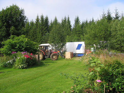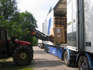 d och på första bilden ser ni hur böckerna kommer med långtradare, en finsk chaufför som inte kunde många ord engelska. Han hade ingenting att lyfta ut böckerna med så vi fick ringa vår snälle granne som släppte vad han höll på med, satte gafflar på traktorn och kom och hjälpte oss lyfte av de 8.000 böckerna.