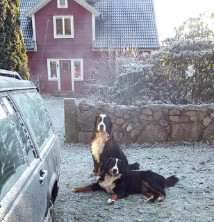 Bilden ovan är inte tagen idag. Nu regnar det på kall mark och det är jättehalt. Min skrivarlya i bakgrunden, Tudor och Kiara i förgrunden.Önskar dig en fin helg, med många ord.Kram från Äventyrsförfattaren Kim