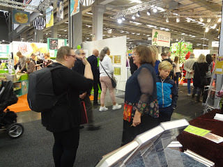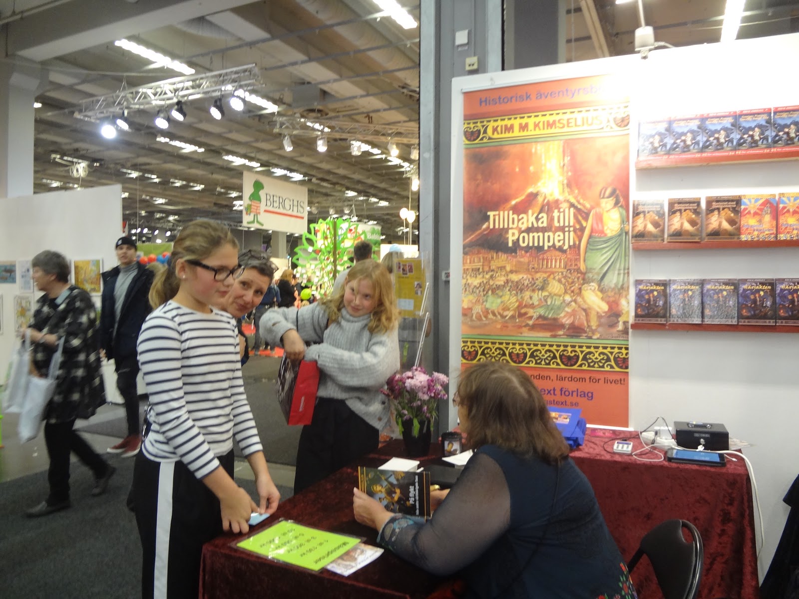 Han blev så besviken när han hörde att det var sista året på bokmässan för min del. Men mamma Jessica löste det genom att ta med Lill-Kim sista morgonen, då det var stort behov av att försöka fylla alla hålen i pyramiderna. Här ser du alla mina fyra monterhjälpare, Jessica, Lill-Kim, Elins-Sofie och Jan på ingång.