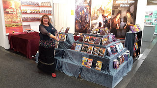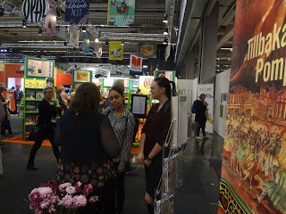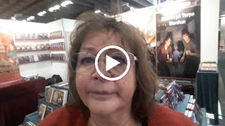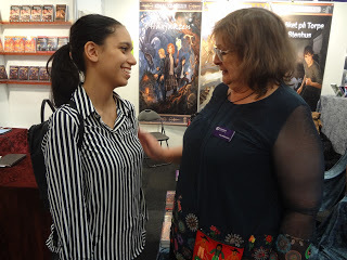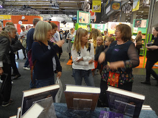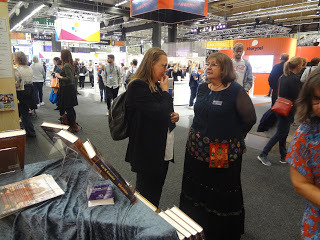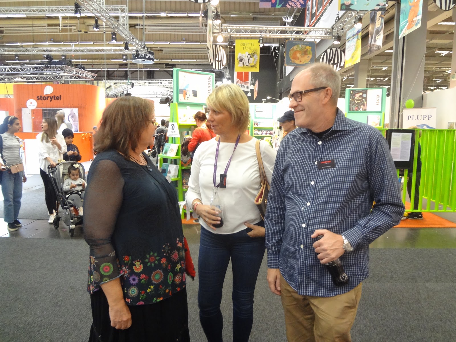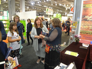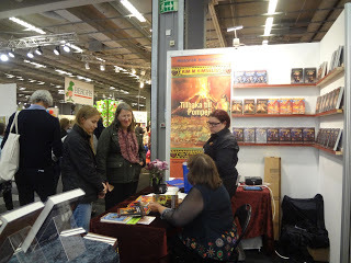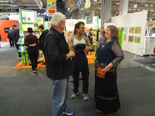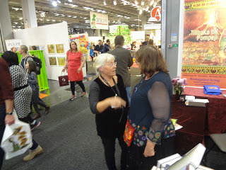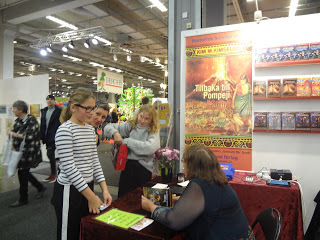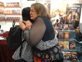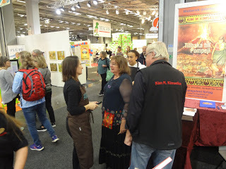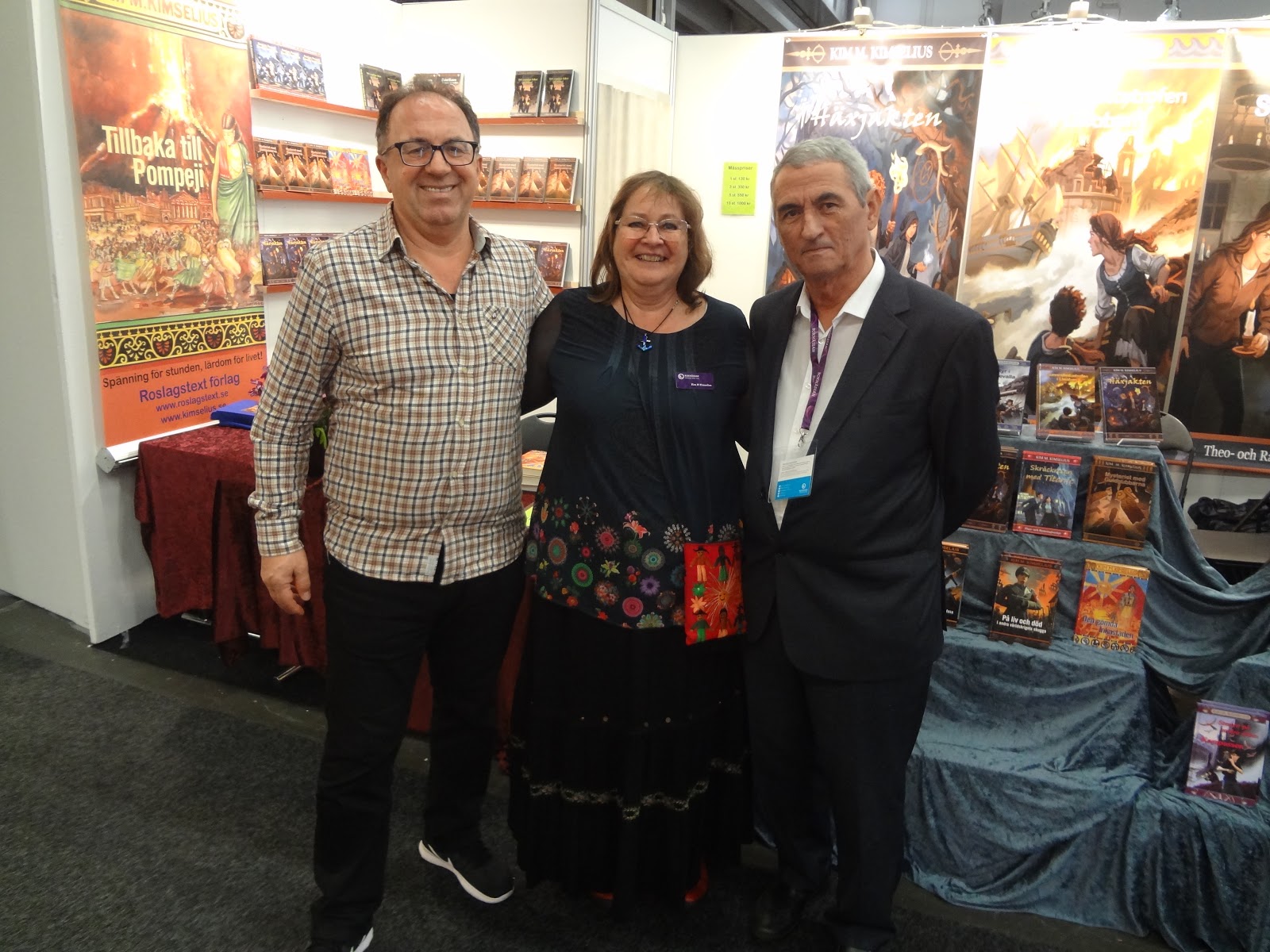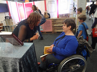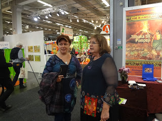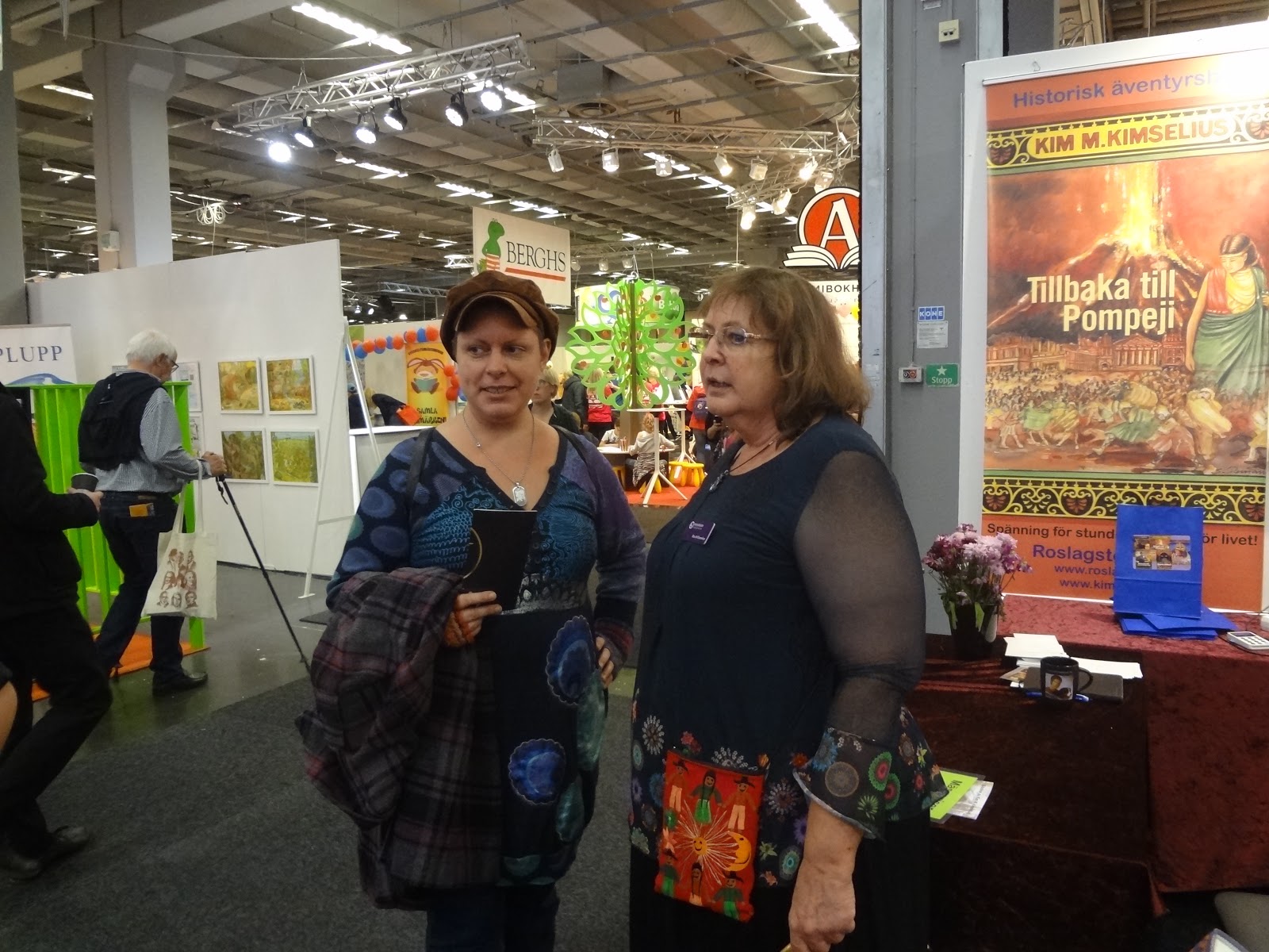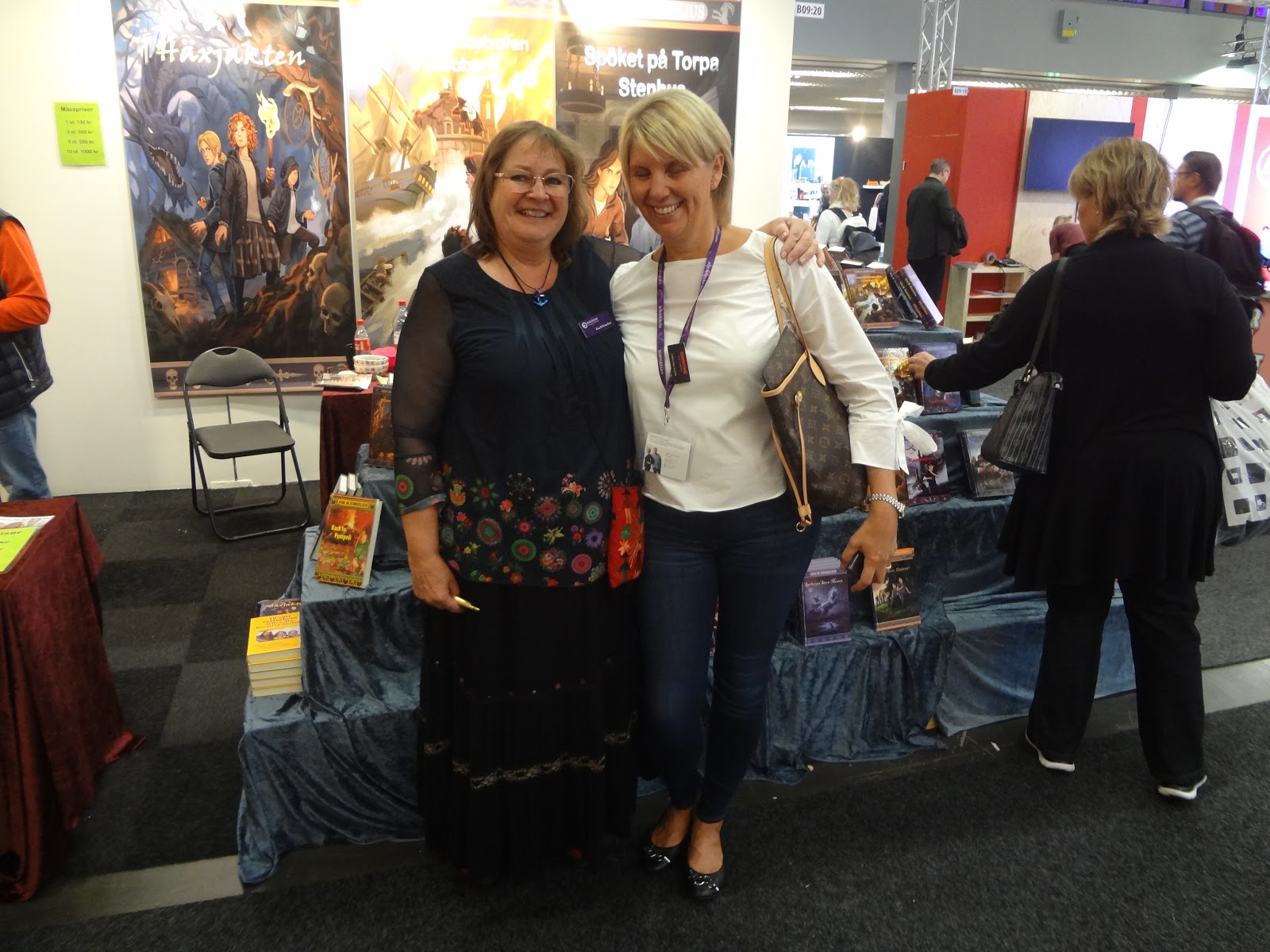 Maria kom förbi och vi hade en trevlig pratstund som alltid. När jag ser fotona förundras jag över hur lite folk det är runt montern vid dessa tillfällen, för jag vet hur mycket jag satt och signerade och hur många böcker vi sålde. Men jag förstår att det är endast när det är lite folk som personalen har tid att fotografera.