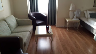 Jag bor i ett fint hörnrum, med soffa, bord och två fåtöljer, samt dubbelsäng, skrivbord och tv.