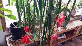 Jag har njutit av att spanienkaktusen blommar som aldrig förr efter att ha fått vara utomhus under den varma sverigesommaren.