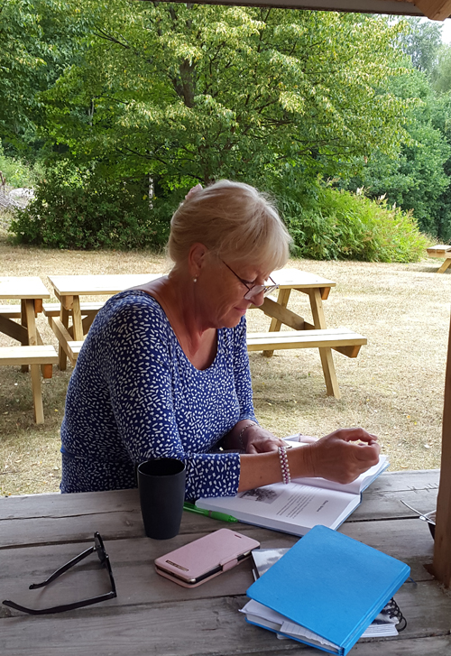 På Färgargården finns det en favoritplats för varje skrivkursdeltagare. Eva Frank har verkligen hittat sin plats. Hon har varit med sedan 2014 när jag höll min första skrivarkurs. Det är utmanande att kunna lära henne nya saker varje gång. Tack!