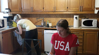 Therese gör iordning i köket, medan Michaela läser resarch inför nästa års Färgargårdsbok "Historiens vingslag runt Färgargården".