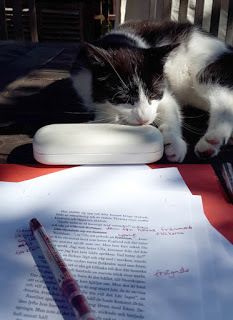 När jag läst korrektur på datorn är det dags att skriva ut hela berättelsen, ta pappersluntan och slå mig ned i skuggan på någon av alla mysiga ställen jag har utomhus. Altanen är en bra plats. Stort bord och utsikt över vår park med grönsaksodlingarna. Om jag sitter där kommer Troll (på bilden) och Trulsa (som ligger i mitt knä) och håller mig sällskap. Det är mysigt.
