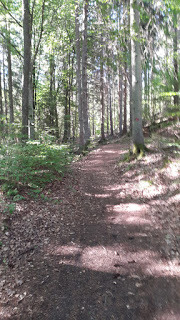 Mjuka skogsvägar leder oss runt på rundan. Jag stannar vid varje skylt och läser frågorna, medan hundarna luktar, eller tar sig ett bad. Fåglarna kvittrar, solljuset strilar ned mellan träden och vinden fläktar skönt.