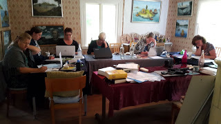 Uppslukade av orden i skrivkurslokalen.Det finns plats både på grundkursen och Eget skrivande. Du kan aldrig ana hur roligt vi har på kurserna. Varje år längtar deltagarna och jag tillbaka, vissa har gått hos mig sedan jag startade skrivarkurser på Färgargården, något jag gjorde sommaren 2014. Tiden går. Det är inspirerande och roligt att få träffa samma personer år efter år och höra hur deras skrivande har utvecklats. Jag delar med mig av mina kunskaper och hjälper till att lyfta deltagarna, få dem att tro på sig själva och utveckla skrivandet ännu mer.