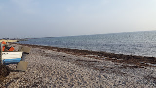 . Förutom att gatan var enkelriktad. Hotellet låg endast 50 meter bort, men jag fick köra en rejäl omväg för att komma från rätt håll. Ovan ser du utsikten från mitt hotellrum. Det var så varmt och skönt att jag hakade upp dörren. Jag var den enda hotellgästen, solen stod på mot rummet och jag hade god lust att sätta mig ned på en av de två stolarna som stod utanför rummet. Men efter att ha suttit hela dagen och hållit skrivarkurs, för att därefter sitta flera timmar i bilen, hade jag spring i benen och gav mig av till stranden, som låg endast 100 meter från hotellet.