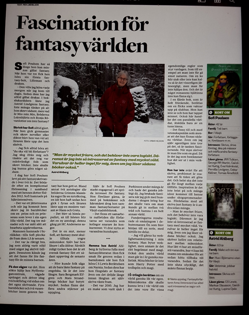 Medan jag duschade kokade maken gröt, så jag kom till dukat bord. Satte igång paddan och läste dagens tidning, BLT. Blev glatt förvånad när jag hittade bilder på två av mina författarvänner, Sofi Poulsen och Astrid Ahlberg, båda fantastiska författare.