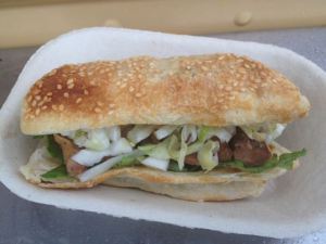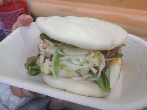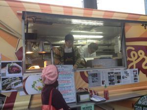 Welcome to mid-November, Vancouver-style. Cold, wet, and rainy. But that didn’t deter us from checking out the winter farmer’s market today outside Nat Bailey Stadium. Less fresh fruit, more fresh root vegetables, several baked good stands doing brisk business, and the the food trucks were out in force. I counted five in all, including one I tried for the first time: Le Tigre Cuisine offering “scrumptious modern Chinese delights”. I was expecting good and got even better:
