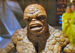 Crazy 70′s kaleidoskope effekts! Somehow, pieces of ship and all four crew members (Reed, Ben, Sue, and Johnny) survive re-entry and all land in de same place. Turn out dey all have superpowerz! Johnny can make fire! Reed be stretchy! Sue can go invisible! In one of best scenes in movie, military arrive and talking to Reed when Ben show up. Everyone shocked except Ben who, for some reason, not even happen to notice he turned into…A BIG ORANGE ROCK MONSTER!