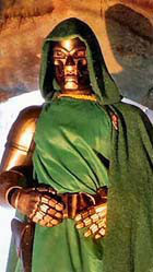 Dr. Doom walk around in metal suit and green robe. His voice sound like he in a tin can somewhere in de next room (monster guess produktion couldn’t be bothered to bring aktor in for dubbing). He always tapping his metal fingerz, click-click-click-click-click. And laughing in good ole’ cheezy superillain fashion: “Moooohoooohahahahahahahahahahaha!”. At least he have positive attitood.