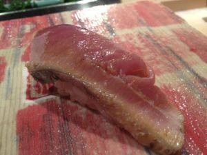The bonito (tuna) is seared over an open flame so that its exterior attains a certain smokiness while its interior maintains that mouth-melting high-grade tuna texture.