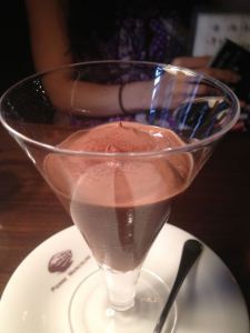 It’s described as a dark chocolate drink. It’s cold, bittersweet, and so thick and rich you have to eat it with a spoon.