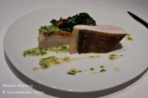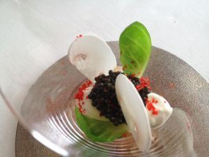 Monkfish prepped in konbu, then yogurt, wrapped in black olive and sepia accompanied by its spinach-wrapped liver with raisins. A stronger, meatier fish that marries well to the black olive and squid ink.
