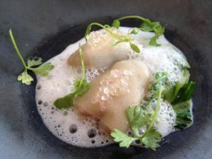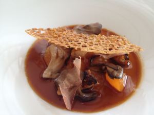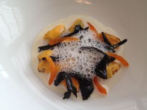 Mussels with trumpet mushrooms, apricot, and lemongrass foam.