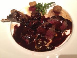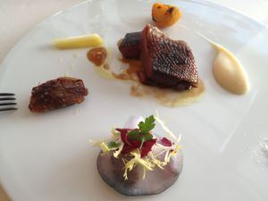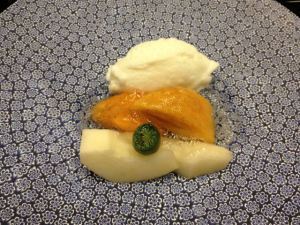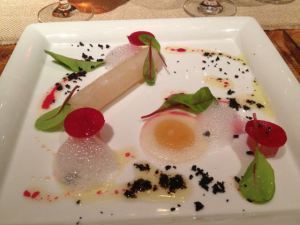 Interesting. Flounder-wrapped around Japanese pear accompanied by a Japanese pear ravioli, beets, seawater gelatin cubes, and black olive tapenade. Quite a few acidic notes.