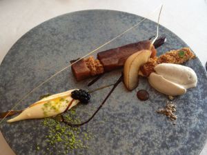 Tarte tain with vanilla ice cream, creme anglaise, roast pear, rusk, and sugar caramel. Another triumph of taste, temperature and textural contrasts – sweet, salty, sour, warm, cold, crispy, crunchy, soft, and chewy.
