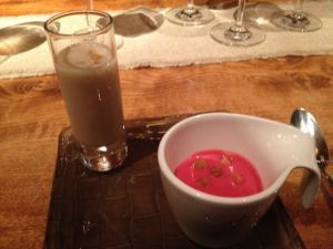 A soup duo: chilled chestnut on the left and a warm beet-laced vegetable medley on the right.
