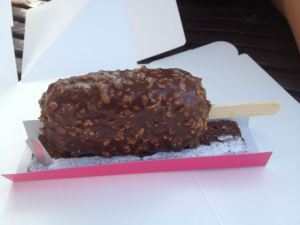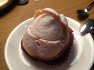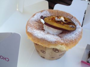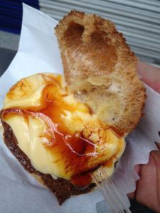 Custard caramel choux creme served hot. It seemed like a good idea at the time – until you realize it’s next to impossible to walk and eat at the same time. Also, good luck finding a garbage can to toss out that sticky napkin and spoon when you’re done.