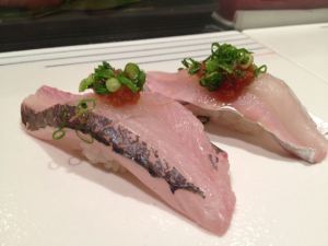 Aji (spanish mackerel). More thickly sliced than in Tokyo.