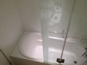 Before we head out, I’m going to hop in the shower. For some mysterious reason, the tub is only half covered. Try not to get the bathroom floor wet.