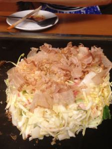 We order two okonomiyaki. The server comes over, mixes together the batter and cabbage and sets it down on the grill. She tops with bonito flakes that do a little dance as they cook.