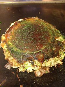 After flipping it, she lets it cook a little longer, then tops with mayo, okonomiyaki sauce (that tastes suspiciously like tonkatsu sauce) and nori.