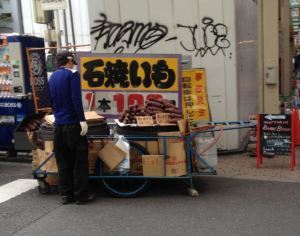 A street vendor sells yaki imo, roasted sweet potatoes – very Japanese street food.