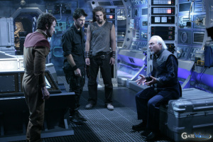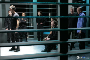 In the showdown between Sheppard and Kolya, the two face-off – and the rest of the Atlantis gang is standing right behind Sheppard. I found it odd that anyone would stand directly behind someone in a potential shoot-out, but the cast was adamant that their characters would “back Sheppard” up. While I appreciated the sentiment, I would have argued that, in this particular instant, one would back someone up without, literally, standing behind them.