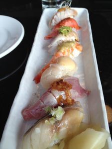 The aburi (flame-seared) nigiri selection. Highly recommended.